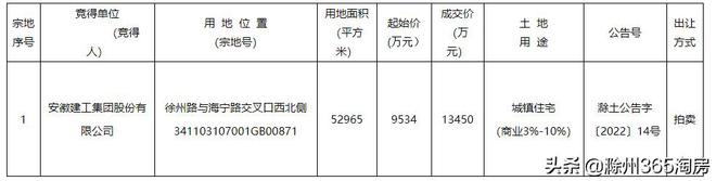 据悉,该地块位于徐州路与海宁路交叉口西北侧,属于滁州经开区,由安徽建工集团股份有限公司拿下,揽金13450万元